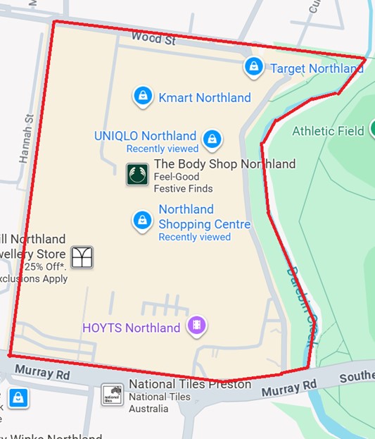 The area that is declared to be a designated place is all public places within Northland Shopping Centre, Preston, being the area bordered by (and inclusive of):